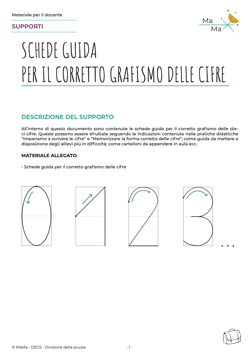 All’interno di questo documento sono contenute le schede guida per il corretto grafismo delle dieci cifre. Queste possono essere sfruttate seguendo le indicazioni contenute nelle pratiche didattiche “Impariamo a scrivere le cifre” e “Memorizzare la forma corretta delle cifre”; come guida da mettere a disposizione degli allievi più in difficoltà; come cartelloni da appendere in aula ecc.